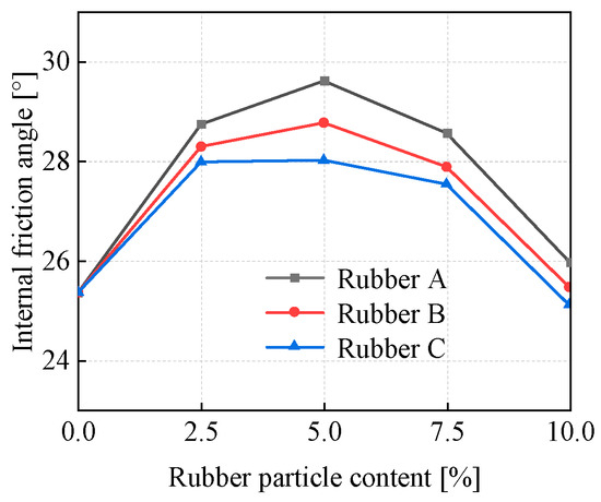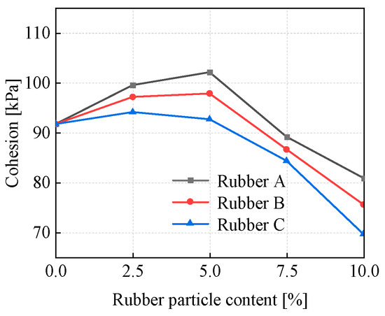 As presented in Figure 7, which takes into account three particle sizes (Rubber A, Rubber B, and Rubber C). The addition of rubber particles significantly increased the cohesion of the samples compared to the samples without rubber particles. With the increase in rubber particle content, the cohesive force of the specimens first exhibits an upward trend and subsequently a downward trend. As the rubber particle content increases, the cohesive force of the specimens initially shows an increasing tendency and then a decreasing one. In the case of the specimens with Rubber C added, the cohesion reaches its peak value when the rubber particle content is 2.5%. For the specimens with Rubber A and Rubber B incorporated, the cohesion reaches its maximum when the rubber particle content is 5%. The incorporation of an appropriate amount of rubber particles exerts a positive influence on the cohesion of the specimens. This can be ascribed to the fact that the addition of rubber particles leads to a reduction in the porosity of the specimens and suppresses the development of cracks [35]. The rubber particles exhibit greater elasticity and a more pronounced small-amplitude rebound effect during testing, leading to higher peak stresses within the specimen [42]. Simultaneously, EICP caused the formation of CaCO3 crystals between the soils. This process established structural continuity and enhanced the bonding strength between soil particles and rubber particles [43]. When the content of rubber particles exceeded 5%, the cohesion of the specimens was generally lower than that of samples without added rubber particles. The findings indicated that the cohesion of the mixed soil mass was influenced by the combined impact of EICP and rubber particles. The distribution patterns and interactions of rubber particles of different sizes within the clay exerted a substantial influence on the cohesion of the mixed soils. Smaller-sized rubber particles have a greater propensity to fill the pores between clay particles. This filling action increases the contact points and friction among the particles. Moreover, it promotes the production of effective CaCO3 in the EICP process, thereby enhancing the cohesion of the soil mixture. Conversely, when the size of the rubber particles is excessively large, the soil forms larger agglomerates. As a result, the effective contact area between the rubber particles and the clay particles is reduced, and the amount of effective CaCO3 produced by EICP is diminished, ultimately resulting in a decrease in cohesion. With the decrease in rubber particle size, the point at which peak cohesion occurs gradually shifted towards higher rubber particle contents. The outcomes demonstrated that the augmentation of cohesion was mainly dependent on the strengthening effect brought about by EICP, along with the size and content characteristics of the rubber particles.