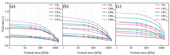 The void ratio–vertical stress relationship curves of samples treated with EICP under different particle sizes (a) Rubber A, (b) Rubber B, and (c) Rubber C.