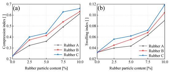 To comprehensively characterize the compressibility and elastic recovery behaviors of rubber-reinforced soils, the compression index (Cc) and swelling index (Cs) were systematically quantified through consolidation testing. The compression index (Cc) was obtained from the slope of the deformation curve within the vertical stress range of 800–1600 kPa, while the swelling index (Cs) was determined from the slope of the deformation curve in the vertical stress range of 1600–800 kPa. Cc is used to predict long-term settlement in foundation design, while Cs is used to quantify recoverable deformation, which is essential for assessing structural resilience under cyclic loading conditions. As depicted in Figure 10, the values of Cc and Cs were graphed in relation to the rubber particle content. With the increase in rubber particle content, both indices display an upward-trending behavior. The compressibility of soil particles is influenced by a multitude of parameters, such as the initial pore ratio, the shape of the particles, the mineralogical composition, and particle size distribution [46]. Among these factors, the initial pore ratio has been determined to be the most crucial element influencing the compressibility of soil particles [47]. As illustrated in Figure 9, as the rubber particle content increases, the quantity of porous rubber particle aggregates also increases, resulting in an augmented initial pore ratio in the specimen. Additionally, during the loading process, the deformation of specimens with a high rubber particle content and a high initial pore ratio becomes more substantial. As a consequence, the value of Cc increases in tandem with the growth of the rubber particle content within the specimen.