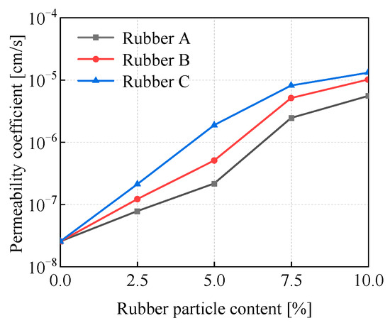 Figure 11 depicts how the content and size of rubber particles exert an influence on the permeability coefficient of the EICP-RC solidified clay. The permeability coefficients show a consistent increase with the rising rubber particle content, peaking at a maximum value at 10% rubber particle content. Clearly, for all samples, the permeability coefficients generally show an upward trend with the increase in rubber particle content. Notably, a substantial increase is witnessed when the content surpasses 7.5%. At 10% rubber particle content, the permeability coefficients of rubber A, rubber B, and rubber C modified clay samples reach 5.54 × 10−6, 1.01 × 10−5, and 1.31 × 10−5 cm/s, respectively. The increase in permeability coefficients of the samples modified using larger-sized rubber particles can be ascribed to the larger continuous surface area. This larger surface area promotes the movement of water within the modified clay samples [52]. Figure 11 demonstrates that for specimens with diverse rubber particle sizes, the permeability coefficients display a comparable upward trend as the rubber particle content grows. Nevertheless, the degree of the increase in the permeability coefficient is contingent upon the size of the rubber particles. In the case of the modified clay samples incorporating Rubber C, the permeability coefficient experiences an almost linear growth, and this growth plateaus as the rubber particle content continues to increase. In the modified clay samples containing Rubber A and Rubber B, when the rubber particle content is below 5%, the permeability coefficients rise in a gradual manner. However, once the content reaches 7.5%, there is a sharp escalation. The change in the permeability coefficient is affected by multiple factors: the interfacial characteristics of the rubber–soil particles, the connectivity within the pore structure, and the tortuosity of the flow paths. The introduction of rubber particles not only enlarges the pore volume in the soil but also initiates water flow at the interface between the clay particle matrix and the rubber particles, thereby resulting in an overall enhancement of the permeability coefficient. Additionally, the inclusion of smaller rubber particles causes an increase in the tortuosity of the water migration paths [53]. This explains why the permeability coefficients of rubber A-modified samples are generally lower than those of rubber B and rubber C.