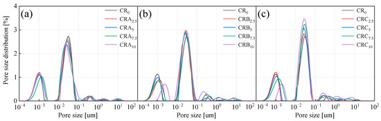 Pore size distribution under different rubber sizes and contents (a) Rubber A, (b) Rubber B, and (c) Rubber C.