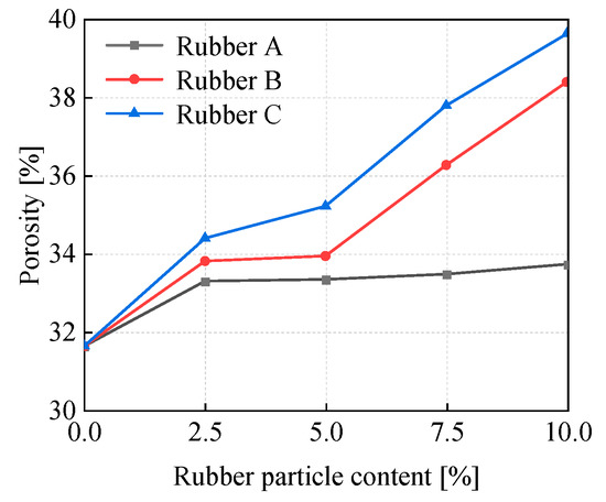 Comparing Figure 12a–c, in the situation of adding Rubber A, with the increase in rubber particle content, the characteristic peaks corresponding to medium-sized and small pores gradually decline. Conversely, the characteristic peaks associated with large pores continuously increase. This suggests that smaller rubber particles are more proficient in filling the pores within the specimens, thereby leading to a reduction in the number of large pores. In the case of adding Rubber B, as the rubber particle content escalates, the characteristic peaks of small pores exhibit a rightward shift, which implies an expansion in pore size. The medium pore characteristic peaks remain relatively stable, but the large pore characteristic peaks gradually increase, a trend consistent with samples containing rubber C. The pore size corresponding to the small pore characteristic peaks also increases with rising rubber particle content. This evidence shows that with the increase in rubber particle size, the pores inside the sample enlarge, consequently resulting in a decline in mechanical properties. This finding is consistent with the outcomes of the triaxial test.