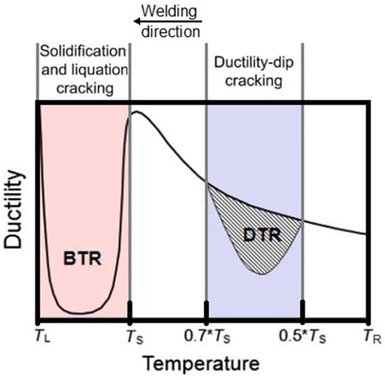 Nowadays, due to its importance in the economy and military, Ni is regarded as a strategic metal, with production consistently rising. The main Ni sources occur in sulfide (39.8%) and laterite (59.5%) deposits []. Most of the Ni produced is utilized for alloying stainless steel (62.7%), manufacturing Ni-based alloys (11.9%), plating (9.7%), and other applications []. The distinct characteristics of Ni and its alloys categorize them as engineering materials suitable for extremely challenging environments. Such environments frequently feature very high or low temperatures and a corrosive atmosphere, causing many materials to degrade after a relatively brief period. Certain Ni-based superalloys can reliably function from cryogenic temperatures up to 1200 °C, a range unmatched by any other materials []. Although Ni and its alloys have several beneficial traits, it is crucial to thoroughly assess their weldability if joining is necessary for product fabrication. While fusion welding is a prevalent joining method, when an alloy exhibits poor weldability, brazing and solid-state welding techniques may be preferred options. The weldability of many Ni and Ni-based alloys is quite good, indicating that a quality welded joint can be achieved fairly easily if the correct welding method is used. Welding certain Ni-based alloys may lead to significant metallurgy-related defects that typically appear as cracking in the weld metal (WM), partially melted zone (PMZ), and heat-affected zone (HAZ). The SSS and PS Ni-based alloys are particularly susceptible to these defects. Various forms of weld joint cracking found in these alloys include solidification and liquation cracking, ductility-dip cracking (DDC), and strain-age cracking (SAC). In terms of weldability, Ni-based SAs are considerably more challenging. Improper welding techniques may also lead to defects associated with the process when bonding Ni and Ni-based alloys. Common instances involve porosity and inclusions in the WM zone, undercuts, insufficient fusion and penetration, and distortion of the workpiece. These flaws can significantly impact the fatigue lifespan and corrosion resistance of constructed materials []. Kojundžić et al. [] examined Ni and its alloys regarding their characteristics, uses, and challenges related to weldability. Basic recommendations to prevent weldability issues are outlined for four specific categories of Ni and its alloys: CP Ni, SSS alloys, PS alloys, and SAs.