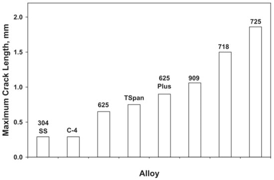 Mechanical characteristics of SSS Ni-based alloys are presented in Table 7. The tensile strength of solid-solution alloys varies between 550 and 830 MPa, whereas the yield strength spans from 275 to 450 MPa []. Alloys 800HT and 800H exhibit excellent strength and resistance to creep at elevated temperatures [,,]. Moreover, these alloys maintain excellent toughness even at cryogenic temperatures.