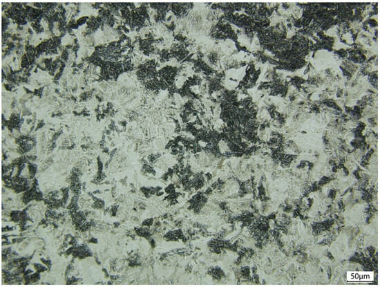 The chemical compositions of the 4130X steel employed in this research are listed in Table 1, and the steel’s microstructure, characterized by using a WUMO WMJ-9370 optical microscope (OM) (Hefei, China), is illustrated in Figure 1. As observed, the fundamental structure of 4130X steel consists of a massive ferrite matrix interlaced with pearlite and bainite phases.