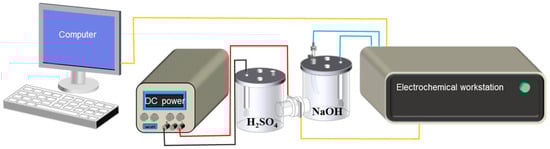 Electrochemical hydrogen permeation experiments were conducted by using Devanathan–Stachurski cells [25,26,27], which typically include a hydrogen-charging cell containing 0.5 mol/L H2SO4 solution, a hydrogen oxidation cell with 0.1 mol/L NaOH solution, and a sample serving to separate the two cells as shown in Figure 2. Prior to hydrogen permeation, all 4130X steel samples were processed by wire cutting and ground into a shape of 30 mm × 30 mm × 1 mm. Subsequently, the hydrogen oxidation side of the sample was electroplated by nickel to reduce the background current. To investigate the effect of hydrogen-charging current density, an external DC power supply was used to adjust the current density of the electrochemical hydrogen-charging side from 10 mA/cm2 to 50 mA/cm2. Meanwhile, variation in oxidation current density at the hydrogen oxidation cell was monitored by an electrochemical workstation to obtain hydrogen permeation parameters. In order to elucidate temperature-dependent hydrogen permeation, experimental temperatures were set at 293 K, 298 K, 303 K, 308 K, and 313 K by controlling a water bath.