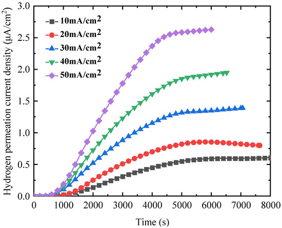 Hydrogen permeation curves versus time at different hydrogen-charging current densities.