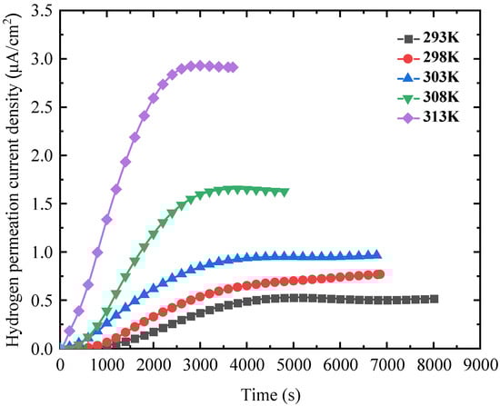 To explore the influence of temperature on the hydrogen permeation behaviour of 4130X steel, hydrogen permeation tests were performed at 293 K, 298 K, 303 K, 308 K, and 313 K, with a charging current density of 10 mA/cm2. The hydrogen permeation transient versus time as a function of temperature is depicted in Figure 4. As shown, increasing the temperature significantly enhances the quasi-steady-state value while also reducing the time required for hydrogen permeation to reach equilibrium. The hydrogen permeation parameters, including hydrogen diffusion coefficient and hydrogen penetration rate , are again calculated and presented in Table 3. These parameters all exhibit an upward trend with increasing temperature.