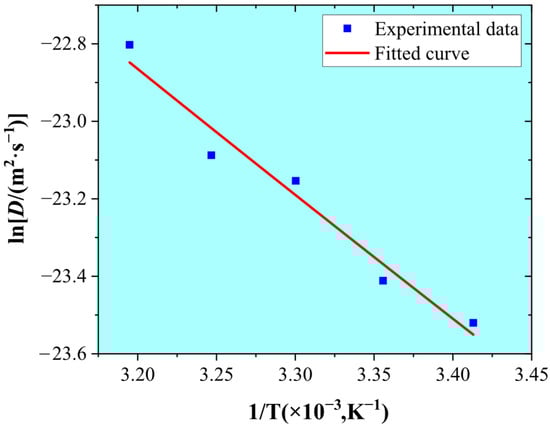 where is the pre-exponential factor; is the gas constant; denotes the temperature; and is the activation energy of hydrogen diffusion. By substituting the experimental data into the Arrhenius relationship, Figure 5 shows the obtained hydrogen diffusivity as a function of the inverse of temperature. The fitted values of and are 2.074 × 10−6 m2/s and 26.973 kJ/mol, respectively, which are consistent with the previous literature results [34,35,36].
