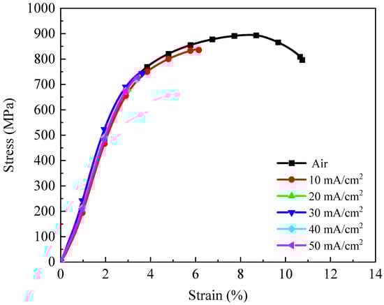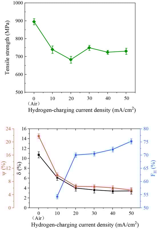 The stress–strain curves of 4130X steel at multiple hydrogen-charging current densities are depicted in Figure 6. It can be seen that the tensile strength and ductility of the hydrogen-charged samples are significantly lower than those of tensile samples in air. For instance, the tensile strength and elongation to failure of 4130X steel in air is 895.15 MPa and 10.74%, while these values are decreased to 839.51 MPa and 6.14%, respectively, under a hydrogen environment with a charging current density of 10 mA/cm2. The detrimental impact of hydrogen on the mechanical properties of Cr-Mo steel has been thoroughly documented in previous studies [21,22,37,38].