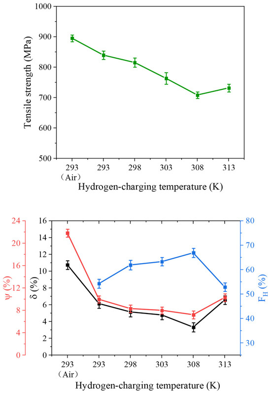 Based on the aforementioned fractographic analysis, it is inferred that ductility decreases as the temperature rises to 308 K, after which it increases with further temperature elevation. At 308 K, quasi-cleavage planes and cracks are observed, indicating that HE susceptibility reaches its peak, which aligns with the HE index depicted in Figure 9.