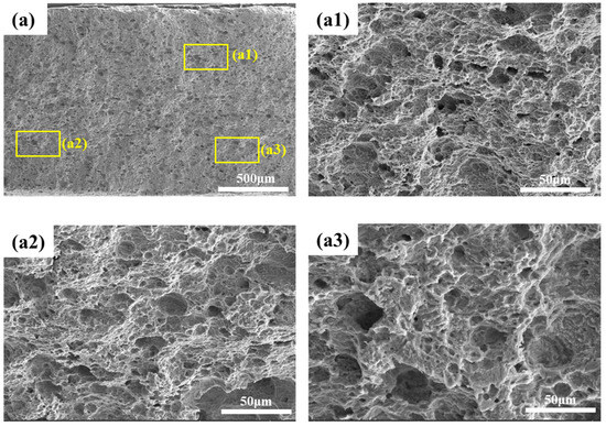(a) Microscale SEM images of the fracture surfaces of non-charged specimens: (a1) High-resolution morphology of the scanning electron microscope image in the upper right region; (a2) High-resolution morphology of the scanning electron microscope image in the lower left region; (a3) High-resolution morphology of the scanning electron microscope image in the lower right region.
