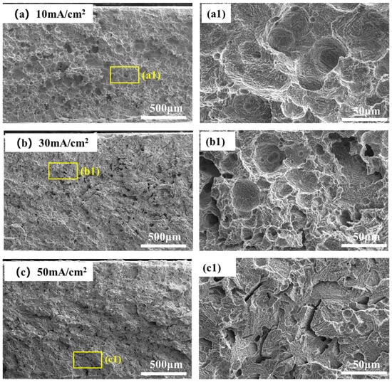 Microscale SEM images of the fracture surfaces of hydrogen-charged specimens at various hydrogen-charging current densities: (a1) corresponds to the high-magnification image of the yellow box in (a); (b1) corresponds to the high-magnification image of the yellow box in (b); (c1) corresponds to the high-magnification image of the yellow box in (c).