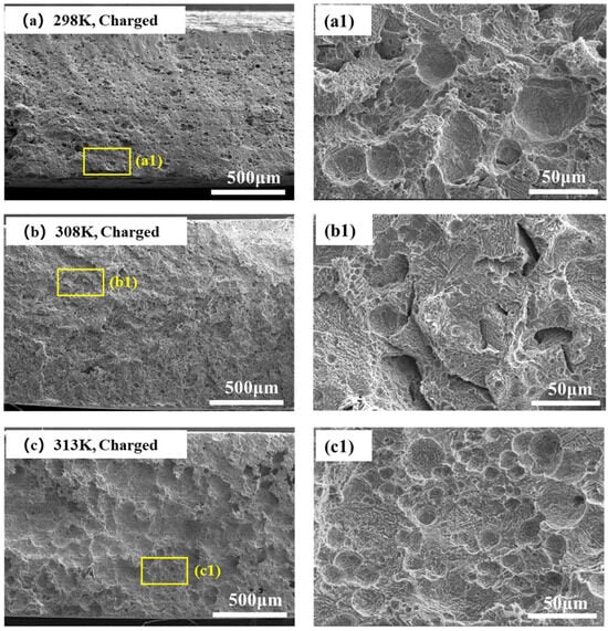 Microscale SEM images of the fracture surfaces of hydrogen-charged specimens at various hydrogen-charging temperatures: (a1) corresponds to the high-magnification image of the yellow box in (a); (b1) corre-sponds to the high-magnification image of the yellow box in (b); (c1) corresponds to the high-magnification image of the yellow box in (c).