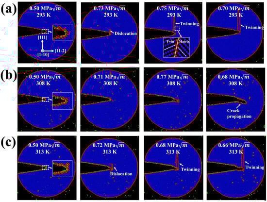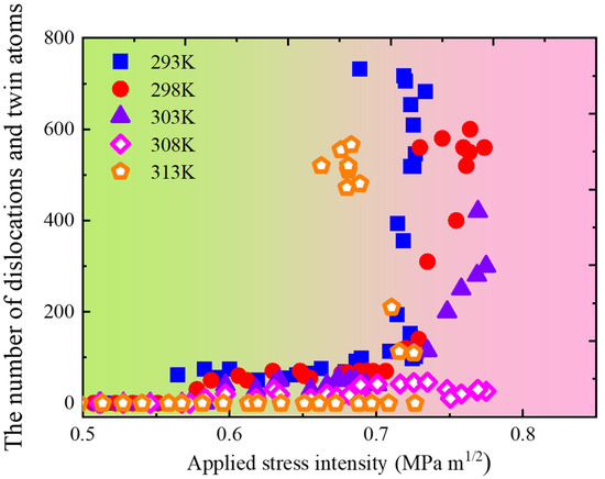 Three observations can be made from these simulations. First, the onset of crack-tip plasticity took place by emission of dislocations and twins at 293 K. Such plasticity was likely responsible for further blunting of the crack tip, which exhibited ductile behaviour. Second, there was a brittle cleavage process at THE,max of 308 K as the crack was seen to propagate along the slip plane without dislocation/twin emission. This behaviour could be explained in terms of increased hydrogen atoms at the crack tip as the temperature increased. The accumulated hydrogen decreased the cohesive energy of atomic planes, thereby encouraging cleavage-like failure within the framework of HEDE theory [10,11,12,47,48]. Lastly, it was observed that crack-tip behaviour was dominated by dislocation/twin emission at 313 K. This result may be surprising because the HEDE mechanism was expected to operate as hydrogen atoms at 313 K () were much higher than at 308 K (). However, HEDE theory may fail when considering complicated plastic activity at the crack tip [52]. To unveil this, dislocation and twin atoms nearby the crack tip as a function of applied stress intensity at various temperatures were identified, traced, and counted, and are shown in Figure 14. It can be seen that at the same stress intensity, the number of dislocations and twin atoms at 313 K were much higher than those at 308 K, implying a higher local plastic activity at the crack tip. Our previous study [53] confirmed that this activity can hinder the crack from cleaving; the crack tip thus showed a ductile pattern at 313 K.