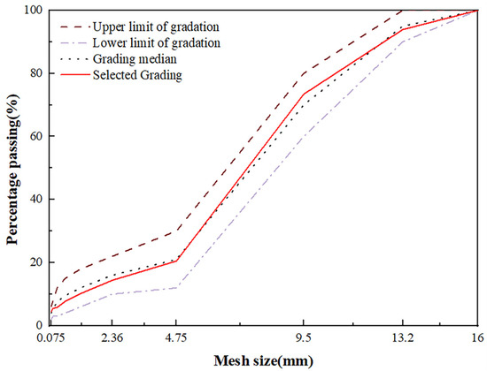 Based on the “asphalt and asphalt mixture test specification for highway engineering” (JTG E20-2011), the drainage asphalt mixture gradation requirements and the mineral material gradation selection is shown in Figure 3. Through the mineral grade selection using Formula (1) for calculation, the oil–rock ratio is 4.87%.