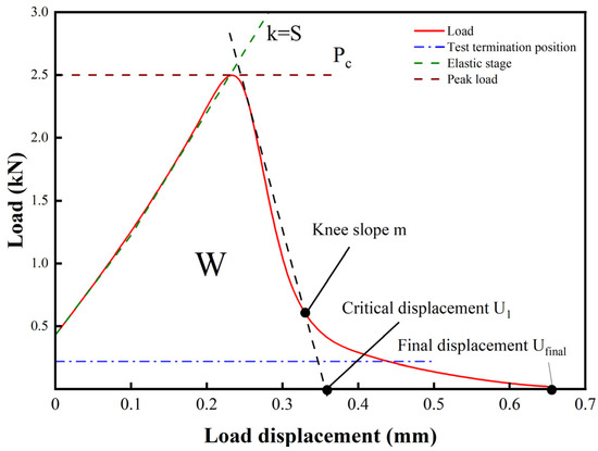 As illustrated in Figure 4, the surface area under the experimental loading curve is the fracture work W, from which the fracture energy can be calculated, and the slope k of the elastic extremity on the curve is the rigidity S of the material.