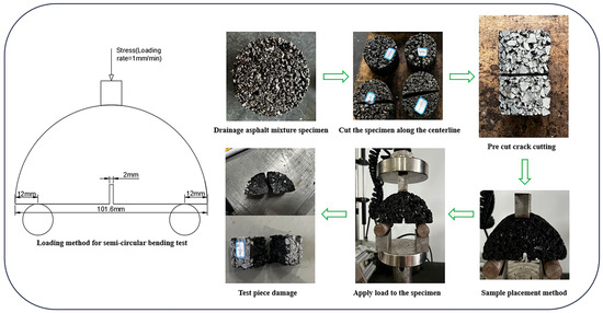 Specimens used in the semicircular bending test were standard hemicircular specimens of 101.6 mm in diameter and 63.5 mm in thickness, and a pre-sliced crack of 2 mm in width was cut in the middle of the specimen [36,37]. In view of reducing the error of the test to the final results, the loading temperature during the test should be as slow as possible. This test was performed using an electronic university testing machine, and the test loading rate was 1 mm/min. Taking into account the limiting minimum pavement temperature of the asphalt mixture [33], as well as with reference to the test temperature during the test of the low-temperature performance test of asphalt in the protocol “AASHTO TP105”, at the same time, based on the typical climate characteristics in China’s alpine regions and the actual needs of road engineering, the temperature range from −15 °C to 0 °C is focused on, which covers the transition threshold range with the highest risk of the low-temperature cracking of asphalt pavement. The final test temperatures are 0 °C, 5 °C, 10 °C, and 15 °C, respectively. Four specimens are taken for a parallel test at each temperature, and the test results are taken as the average value. The SCB loading mode and test process are shown in Figure 5.