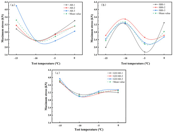 The maximum stress of SCB specimens at different temperatures: (a) Variation of AR maximum stress with temperature. (b) Variation of SBS maximum stress with temperature. (c) Variation of GO/AR maximum stress with temperature.