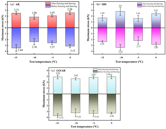 A comparison of the maximum stress before and after freeze–thaw cycles: (a) Maximum stress before and after AR freeze-thaw cycle. (b) Maximum stress before and after SBS freeze-thaw cycle. (c) Maximum stress before and after GO/AR freeze-thaw cycle.