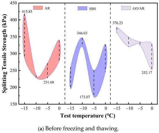 The splitting tensile strengths of the three modified asphalts at different temperatures are shown in Figure 9a and Figure 9b, respectively. Figure 9a shows the range of splitting tensile strengths before freezing and thawing cycles, and Figure 9b shows the range of splitting tensile strengths after freezing and thawing cycles. As can be seen in Figure 10a, the range of the split tensile strength of drainage asphalt mixtures prepared with rubber powder-modified asphalt is between 415.83 −231.68 kPa at −15 °C to 0 °C, and the range of the split tensile strength of drainage asphalt mixtures prepared with SBS-modified asphalt is between 346.03–173.07 kPa at −15 °C to 0 °C. The graphene/rubber powder compound modified asphalt-prepared drainage asphalt mixture is at −15 °C to 0 °C, with a split tensile strength range between 376.23–252.17 kPa. from Figure 10b, it can be seen that the rubber powder-modified asphalt-prepared drainage asphalt mixture is at −15 °C to 0 °C, with a split tensile strength range between 275.24–162.37 kPa, and the split tensile strength of drainage asphalt mixtures prepared by SBS-modified asphalt ranged from 298.01–131.68 kPa at −15 °C to 0 °C, and the split tensile strength of drainage asphalt mixtures prepared by graphene/rubber powder compound modified asphalt ranged from 316.83–230.69 kPa at −15 °C to 0 °C.