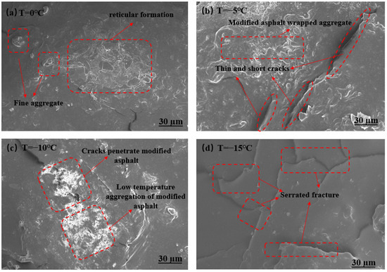 As can be seen from Figure 11a, the graphene flake layer and rubber powder particles are dispersed more uniformly in the asphalt matrix at 0 °C, forming a continuous mesh reinforced structure. The pore distribution is uniform, and the interface between asphalt mortar and aggregate is tightly combined without obvious cracks or defects. At this temperature, the elastic deformation capacity of rubber powder is dominant, which can effectively absorb small stresses, and the high modulus of graphene can limit the local deformation through the role of “bridging” to delay the emergence of cracks. As can be seen from Figure 11b, showing −5 °C localized areas of short cracks, cracks start from the edge of the aggregate or pore space. Graphene flakes appear slightly agglomerated, but still with the rubber powder to form a crosslinked structure, and low-temperature asphalt mortar brittleness increases, the stress is concentrated in the pore or aggregate interface, and the crack deflection effect of graphene and the elastic dissipation of the rubber powder can still partially inhibit the crack expansion. From Figure 11c, it can be seen that the number of cracks under −10 °C increased significantly, and some of the cracks occurred through the graphene/rubber powder composite modified asphalt. Pore edges appear in a “jagged” fracture morphology, the asphalt matrix rigidity is dominant, it has a rubber powder elasticity failure, the graphene enhancement effect is limited by its low-temperature compatibility with the matrix, and the crack extension energy exceeds the composite material load-bearing threshold. From Figure 11d, it can be seen that −15 °C presents a large-scale continuous crack network, graphene lamellae are pulled off or peeled off, and the rubber powder particles are separated from the matrix to form holes. The overall structure is loose, and the permeable pores are connected by the cracks. The composite material undergoes brittle fracture at extremely low temperatures, and the reinforcing effect of graphene and the toughening mechanism of rubber powder fail, and the cracks expand rapidly along the stress concentration area.