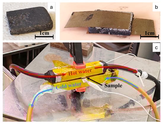 (a) The 6:3:1-75-20D specimen tested for thermoelectric properties. (b) Sample prepared between two Cu–Ag foil sheets attached with silver paste. (c) Assembled thermoelectric testing system. Red arrows represent the flow of the hot water, blue ones represent the flow of cold water, and the black one indicates the sample positioning.