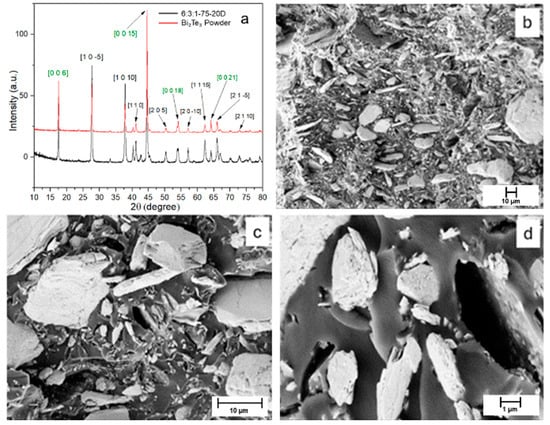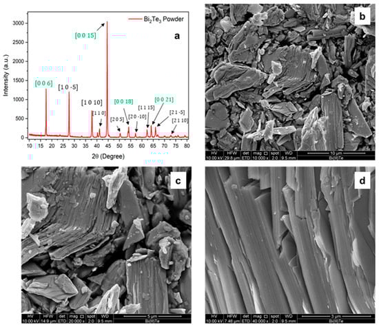 (a) XRD pattern of the Bi2Te3 powder and of the loaded resin. The green highlighted directions represent multiples of the main crystallographic direction [0 0 3]. (b–d) SEM images of the powder at higher magnification. Laminated pattern is visible following a certain direction.