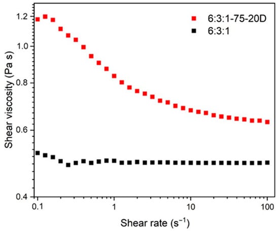 The rheological analysis (Figure 3) shows that the loaded resins exhibit a shear-thinning behavior, with the viscosity decreasing from 1.2 Pa·s at a shear rate of 0.1 s−1 to 0.65 Pa·s at 100 s−1. According to the literature [36], the viscosity range required for a resin to be considered printable lies between 0.25 and 5 Pa·s. Therefore, the developed resins satisfy the printability requirements across the entire shear rate range investigated.