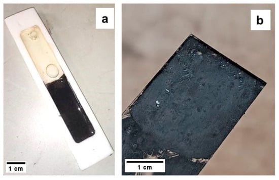 (a) The 6:3:1-75-20D sample inside a Teflon mold alongside the 6:3:1 resin, thermally cured at 100 °C; (b) the 5:5:1-50-1B sample cured under a UV lamp for 5 min.