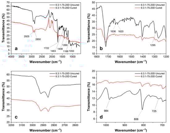 (a) General FTIR spectra of cured (red) and uncured (black) 6:3:1-75-20D with highlighted peaks; (b–d) detail of relevant peaks.