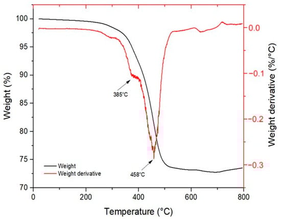 In detail, several characteristic peaks were identified: the peaks at 2925 cm−1 and 2850 cm−1 correspond to the stretching vibrations of the CH3 and CH2 groups, respectively. The strong absorption at 1722 cm−1 is associated with the C=O stretching of ester groups. Peaks at 1636 cm−1 and 1620 cm−1 are related to the C=C stretching vibrations of alkenes. The bands at 1463 cm−1 and 1408 cm−1 are attributed to the bending vibrations of methyl groups. Peaks at 1269 cm−1, 1188 cm−1, 1050 cm−1, and 924 cm−1 are assigned to the symmetric and asymmetric stretching of C–O–C ester bonds. The absorption at 806 cm−1 corresponds to the out-of-plane bending vibration of the vinyl groups present in the acrylate moieties. The C=C stretching peaks show a significant decrease in intensity after curing, indicating the completion of the crosslinking reaction. Similarly, the 806 cm−1 peak, associated with the out-of-plane vibration of the vinyl group, decreases due to the consumption of double bonds in favor of newly formed C–C single bonds. The overall reduction in molecular mobility, a result of the formation of a three-dimensional polymer network, is also evident from the decreased intensity of the 2925 cm−1 and 2850 cm−1 bands. The thermal degradation curve was obtained through TGA analysis on the specimen containing 20 wt% of DCP. As shown in Figure 6, at 800 °C, the specimen retains approximately 75 wt% of its original mass, indicating that the polymeric matrix has completely degraded while the metallic filler remains stable, confirming the expected nominal filler content in the resin. The degradation process occurs in two main steps. The first degradation event appears at around 385 °C, corresponding to the fragmentation and decomposition of non-reacted triglycerides. The second step, occurring at 458 °C, is attributed to the decomposition of the remaining main polymer chains. The material demonstrates good thermal stability, with a 5% mass loss occurring at 288 °C. This behavior is indicative of a high crosslinking density achieved during the curing process. Moreover, the absence of a peak around 100 °C suggests that the specimen was completely dry, as no mass loss associated with water evaporation was detected.