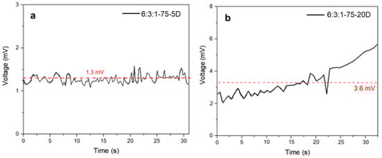 Thermoelectric analysis of 6:3:1-75-5D (a) and 6:3:1-75-20D (b) specimens. The red dotted line shows the average potential generated by the samples.