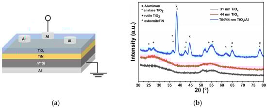 (a) Schematic diagram of Al/TiOx/TiN/Si(n++)/Al MIM device structure. (b) GI-XRD patterns of the TiOx thin films deposited on Si(100) for different thicknesses and the TiN/TiOx (44 nm)/Al tri-layer structure.