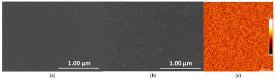 Figure 2a,b display FE-SEM images of TiOx thin films with 31 nm and 44 nm thicknesses, respectively. Both films exhibit a uniform surface structure. The surface of the 31 nm TiOx film appears very smooth, while the 44 nm film shows a comparatively rougher surface, attributed to a higher concentration of agglomerates [50]. Given that the 44 nm TiOx film exhibits a rougher surface than the 31 nm film, only the 44 nm film was selected for quantitative surface roughness analysis using atomic force microscopy (AFM). The surface morphology was investigated using a Bruker Dimension Icon AFM system (Santa Barbara, CA, USA) operated in PeakForce Tapping mode (Bruker, Billerica, MA, USA) with silicon nitride probes featuring sharp tips (tip radius ~ 2 nm). A representative AFM image over a 1 × 1 μm2 area of the 44 nm TiOx film is illustrated in Figure 2c. The surface roughness was quantified by calculating the root mean square (RMS) roughness from AFM height data collected over a 10 × 10 μm2 scan area. The RMS roughness was determined to be 0.2 ± 0.05 nm, indicating a homogeneous surface with small grains, consistent with observations from the SEM analysis.