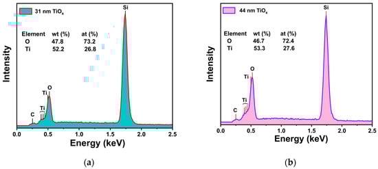 EDX spectrum of TiOx thin films for two different thicknesses, (a) 31 nm and (b) 44 nm.