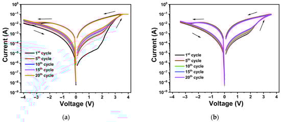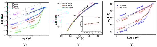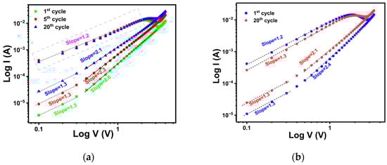Figure 5c shows the double-logarithmic I–V curves for the 44 nm TiOx film under positive bias. Regardless of the number of cycles, HRS displayed a change in slope from 1.2 to 2.0, followed by a sharp increase in current as voltage increases, consistent with the trap-controlled SCLC model [57]. In LRS, the log I–log V curves showed a slope of approximately 1.3 at low bias and 1.7 at high bias, again suggesting that ohmic and Schottky emission mechanisms dominate the conduction process.