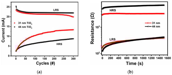(a) Endurance plot for 31 and 44 nm TiOx thin-film HRS and LRS currents read at 2.0 V (300 cycles, Ic = 100 mA). (b) Retention performance of the devices based on 31 and 44 nm TiOx thin films, read at 0.5 V.