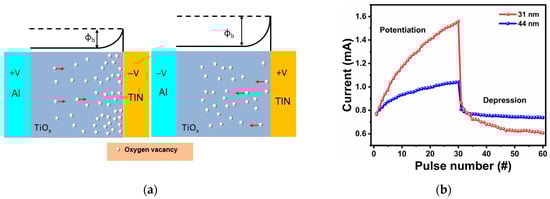 To replicate key functionalities of biological synapses using the Al/TiOx/TiN memristor, pulsed current–voltage (I–V) measurements were conducted for devices with both 31 nm and 44 nm TiOx film thicknesses. In this context, the applied voltage pulses act as external stimuli, while the resulting current responses represent changes in synaptic weight. A critical feature of biological synapses is their ability to modulate synaptic strength incrementally in response to repeated stimuli, known as long-term potentiation (LTP) and long-term depression (LTD). These synaptic behaviors can be emulated in memristors by controlling the direction and duration of the applied voltage pulses, in line with the flux-controlled memristor model [73]. When 30 consecutive positive voltage pulses (2 V, 200 ms) are applied, the conductance of the memristors gradually increases. Conversely, applying 30 successive negative pulses (−2 V, 200 ms) leads to a gradual reduction in conductance as illustrated in Figure 8b. This bidirectional modulation corresponds to LTP (increased conductance) and LTD (decreased conductance), both of which are crucial for mimicking the adaptive learning processes observed in computational neuroscience, neural networks, and biological systems [74].
