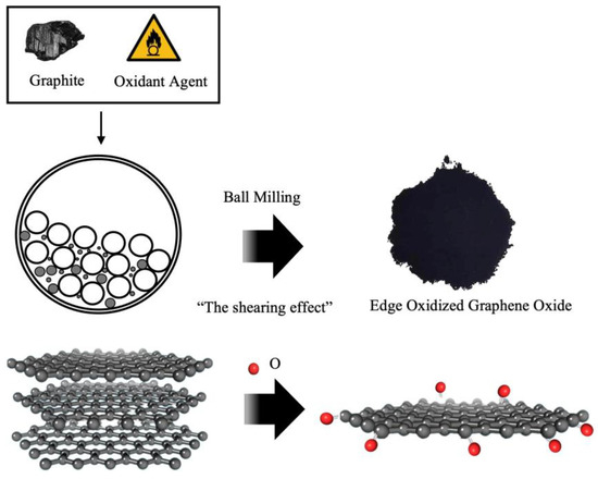 To overcome the cost limitation, a cost-effective graphene oxide, edge-oxidized graphene oxide (EOGO), was introduced. EOGO features oxygen groups located at the edges of graphene, generated through ball milling technology to address cost-related concerns [18]. The detailed process of EOGO production is presented in Figure 1. Relatively inexpensive carbon nanomaterials can be manufactured at less than USD 100 per kilogram using this method. Compared to CNTs, which are often used as additives, which cost USD 400 per kilogram, and GO, which costs USD 300 per gram, EOGO has a significant price advantage.
