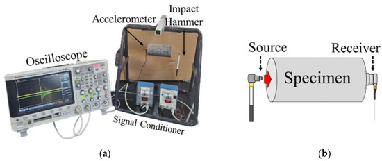 As shown in Figure 4a, the Free-Free Resonance Column (FFRC) test consists of a hammer and an accelerometer that detects wave signals. The specimens were made in the form of cylinders with a diameter of 50 mm and a height of 100 mm. The experiment was conducted in a state where both ends were free, and the stiffness was obtained through elastic waves generated by external impacts, according to the theory of elastic wave propagation. When the hammer impacts the specimen as seen in Figure 4b, resonance occurs. The resonance frequency, determined via FFT, is used to compute the unconfined compression wave velocity (Vc), and Young’s modulus (E) is then determined via Equations (1) through (3):