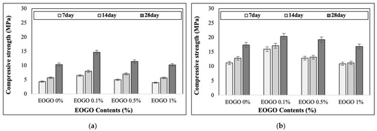 The results of compressive strength are shown in Figure 5. Figure 5a presents the results under room curing conditions, while Figure 5b shows the results under heat curing conditions. The results indicated that the compressive strength increased with longer curing times, irrespective of the EOGO content. This is due to the extended curing time, which allows for further polymerization and enhances long-term strength.