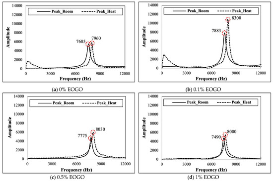 The results of the elastic modulus were obtained through the FFRC test. When a hammer hit the specimen, as seen in Figure 4, the resonance frequency was measured. The first modes of the resonance frequency are shown in Figure 6. It is shown that heat curing produced a higher resonant frequency than room curing. At 1% EOGO, the highest resonance frequency was observed, exhibiting 7883 Hz and 8300 Hz for room and heat curing, respectively.