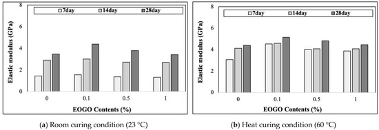 Effect of EOGO content on elastic modulus of FA-EOGO geopolymer: (a) room curing condition (23 °C); (b) heat curing condition (60 °C).