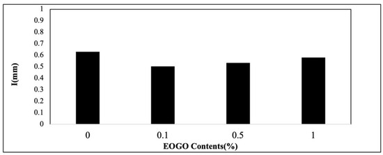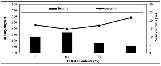 The results of the density and void contents are presented in Figure 8. As the EOGO content increases, the density increases, with the maximum at 0.1% EOGO; however, it decreases after 0.1%. At 0.1% EOGO, the maximum density is 1568 kg/m3, and the minimum void content is 15%. The densities of 0.5% and 1% EOGO are lower than the control (0% EOGO). The results of the density and porosity show that EOGO was most uniformly dispersed at 0.1%, suggesting that nano-sized EOGO may fill the micro-sized pores. At 0.5% and 1% EOGO, a higher number of air voids can be formed due to the agglomeration of EOGO, which decreases the density and increases the void content.