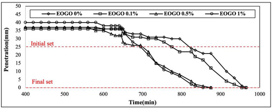 As seen in Figure 10, 0.5% EOGO and 1% EOGO exhibit a significant decrease in penetration over time, with the most rapid and significant reduction in 1% EOGO. When 1% EOGO and 0% EOGO are compared, the difference in the initial setting time is about 80 min, and the difference in the final setting time is about 100 min. It is confirmed that the addition of EOGO reduces the setting time of the geopolymer (see Figure 11).