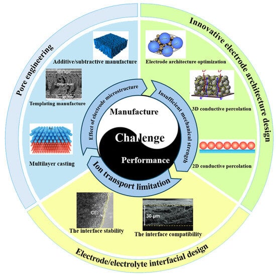 Schematic diagram of the relationship between manufacturing challenges and performance optimization strategies in thick cathodes design [,,,,,,,].