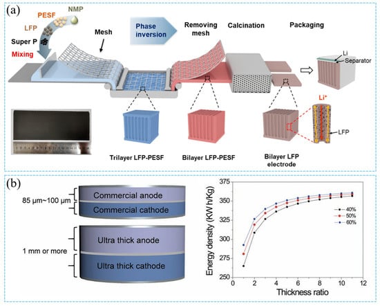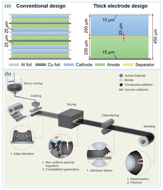 (a) The comparison diagram of thin electrode stacking structure and thick electrode structure []. Reproduced with permission from [John Wiley and Sons], [2019]. (b) Schematic diagram of cathode preparation process []. Reproduced with permission from [Springer Nature], [2025].