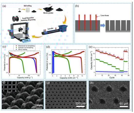 One of the main advantages of additive manufacturing is its highly ordered manufactured microstructure (Figure 3f), low tortuosity, and high rate performance []. However, a drawback is that the pore channel diameters tend to be large due to the resolution limitations of the processing equipment []. Subtractive manufacturing methods include femtosecond laser sintering (Figure 3b). As shown in Figure 3g,h, this technique uses an ultrashort pulse laser as the power source to sinter powdered materials in a low-oxygen environment []. A key benefit of this approach is that the cathode-casting process does not require significant modification. Additionally, it ensures high compatibility with existing manufacturing techniques [,]. Nonetheless, the drawbacks of subtractive manufacturing techniques involve comparatively elevated capital expenditures and extended financial amortization periods [], low throughput, longer production time, and the possibility of droplet generation within the laser cutting kerf resulting from partial melting of cathode materials [].