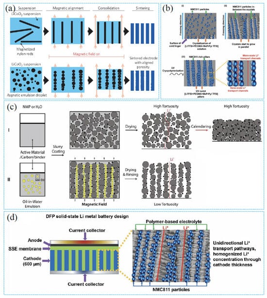 (a) Fabrication of electrodes via magnetic alignment of magnetic microrods embedded in a sacrificial phase []. Reproduced with permission from [Springer Nature], [2016]. (b) Schematic illustration of the preparation of low-tortuosity electrodes in comparison with that of conventional electrodes []. (c) The SSLMB architecture features an anisotropic cathode structure featuring vertically oriented NMC811-enriched pillars enclosed by a polymer-based electrolyte []. Reproduced with permission from [John Wiley and Sons], [2018]. (d) The procedures involved in the directional freezing-polymerization (DFP) technique for fabricating anisotropic cathode architectures [].